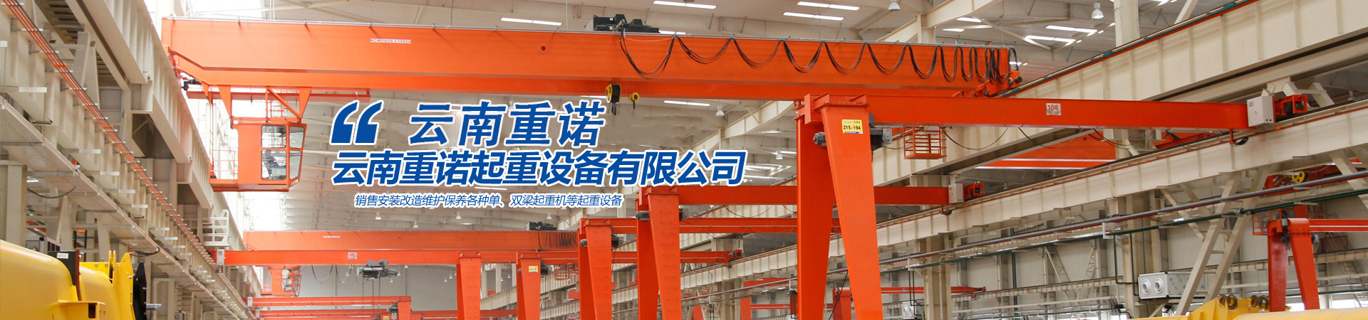 云南重諾起重設(shè)備有限公司主要經(jīng)營銷售:橋式起重機(jī)、門式起重機(jī)、懸掛起重機(jī)、旋臂起重機(jī)、電動葫蘆、升降貨梯、電動平車、液壓升降平臺、升降搬運(yùn)設(shè)備、起重配套工具、起重軸承、起重機(jī)各部位配件。公司產(chǎn)品暢銷全國各地,深受用戶的信賴。  公司通過了ISO9001 :2000質(zhì)量體系認(rèn)證具備320T及以下噸位橋式起重機(jī)、280T及以下噸位門式起重機(jī)特種設(shè)備制造許可證.320T及以下起重機(jī)的特種設(shè)備安裝......更多>>